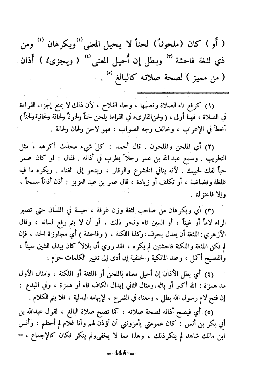 (¬4) أي بطل الأذان إن أحيل معناه باللحن أو اللثغة أو اللكنة، ومثال الأول مد همزة: الله أكبر أو بائه ومثال الثاني إبدال الكاف فاء أو همزة وفي المبدع: إن فتح لام رسول الله بطل، ومعناه في الشرح، لإيهامه البدلية فلا يتم الكلام.
