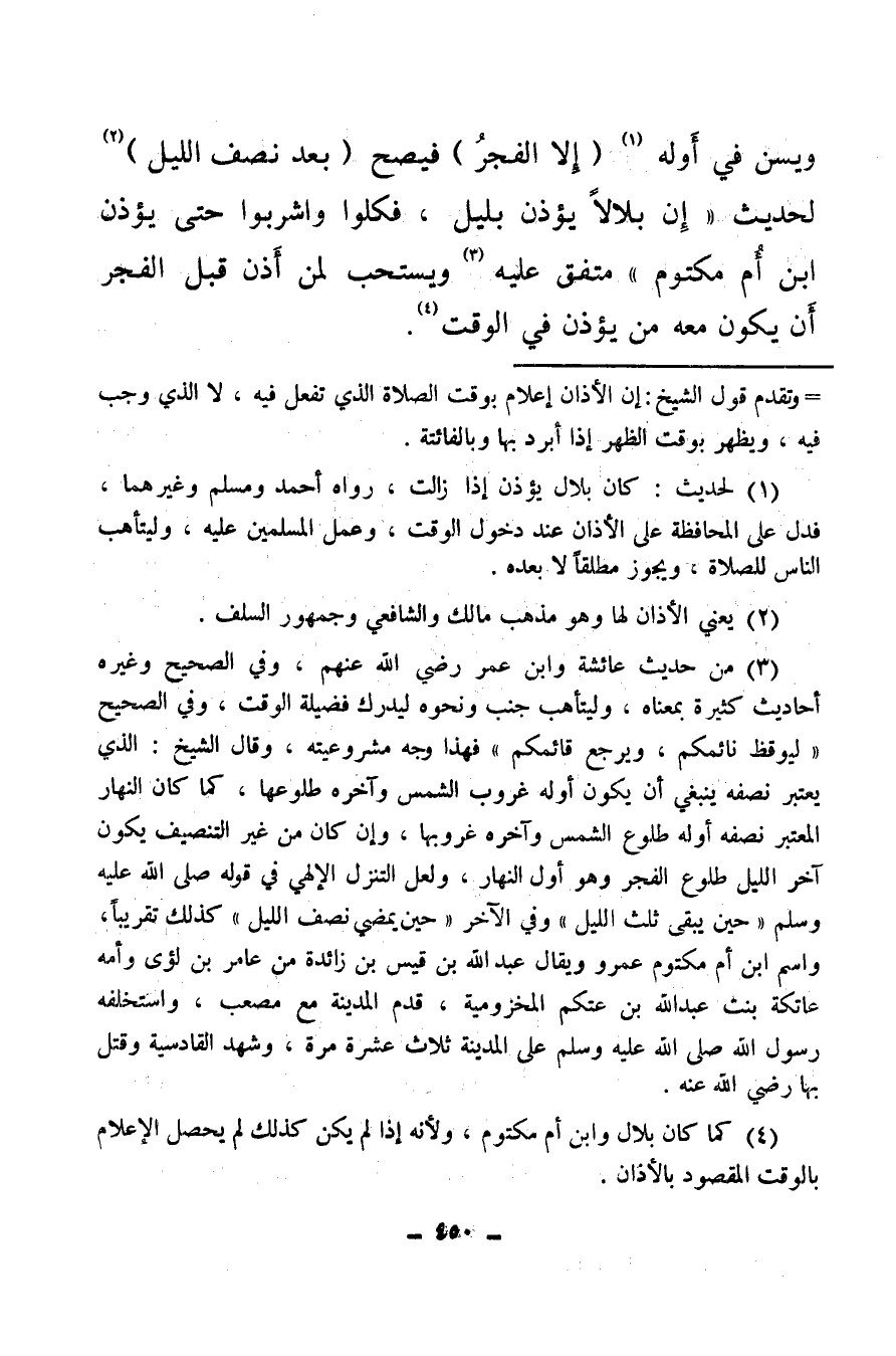 (¬3) من حديث عائشة وابن عمر رضي الله عنهم، وفي الصحيح وغيره أحاديث كثيرة بمعناه وليتأهب جنب ونحوه ليدرك فضيلة الوقت، وفي الصحيح ليوقظ نائمكم ويرجع قائمكم فهذا وجه مشروعيته، وقال الشيخ: الذي يعتبر نصفه ينبغي أن يكون أوله غروب الشمس وآخره طلوعها، كما كان النهار المعتبر نصفه أوله طلوع الشمس وآخره غروبها، وإن كان من غير التنصيف يكون آخر الليل طلوع الفجر وهو أول النهار، ولعل التنزل الإلهي في قوله صلى الله عليه وسلم حين يبقى ثلث الليل، وفي الآخر، حين يمضي نصف الليل، كذلك تقريبا، واسم ابن أم مكتوم عمرو ويقال عبد الله بن قيس بن زائدة من عامر بن لؤي وأمه عاتكة بنت عبد الله بن عتكم المخزومية، قدم المدينة مع مصعب، واستخلفه رسول الله صلى الله عليه وسلم على المدينة ثلاث عشر مرة، وشهد القادسية وقتل بها رضي الله عنه.