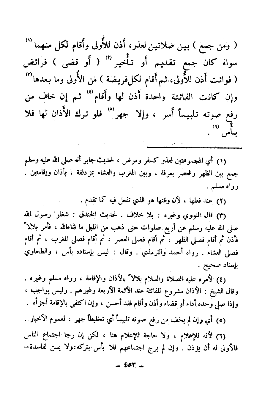 (¬1) أي المجموعتين لعذر كسفر ومرض، لحديث جابر أنه صلى الله عليه وسلم جمع بين الظهر والعصر بعرفة، وبين المغرب والعشاء بمزدلفة بأذان وإقامتين رواه مسلم.