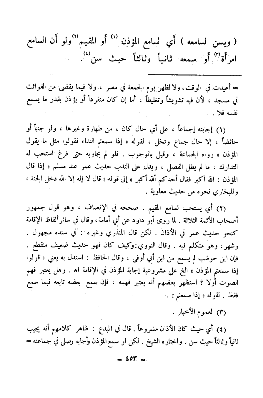 (¬4) أي حيث كان الأذان مشروعا، قال في المبدع: ظاهر كلامهم أنه يجيب ثانيا وثالثا حيث سن، واختاره الشيخ. لكن لو سمع المؤذن وأجابه وصلى في جماعته لم يجب الثاني، لأنه غير مدعو بهذا الأذان وإجابة الأول أفضل، إلا أذاني الفجر فهما سواء.