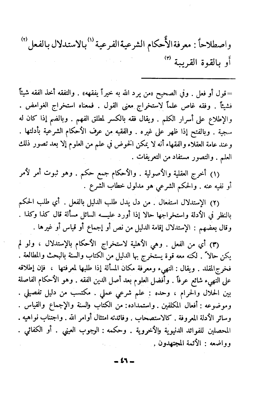 (¬3) أي من الفعل: وهي الأهلية لاستخراج الأحكام بالاستدلال، ولو لم يكن حالا، لكنه معه قوة يستخرج بها الدليل من الكتاب والسنة بالبحث والمطالعة فخرج المقلد ويقال: التهيئ ومعرفة مكان المسألة إذا طلبها لمعرفتها، فإن إطلاقه على التهيئ شائع عرفا، وأفضل العلوم بعد أصل الدين الفقه، وهو الأحكام الفاصلة بين الحلال والحرام، وحده: علم شرعي عملي، مكتسب من دليل تفصيلي، وموضوعه: أفعال المكلفين، واستمداده: من الكتاب والسنة والإجماع والقياس، وسائر الأدلة المعروفة، كالاستصحاب، وفائدته امتثال: أوامر الله، واجتناب نواهيه، المحصلين للفوائد الدنيوية والأخروية، وحكمه: الوجوب العيني، أو الكفائي، وواضعه: الأئمة المجتهدون.