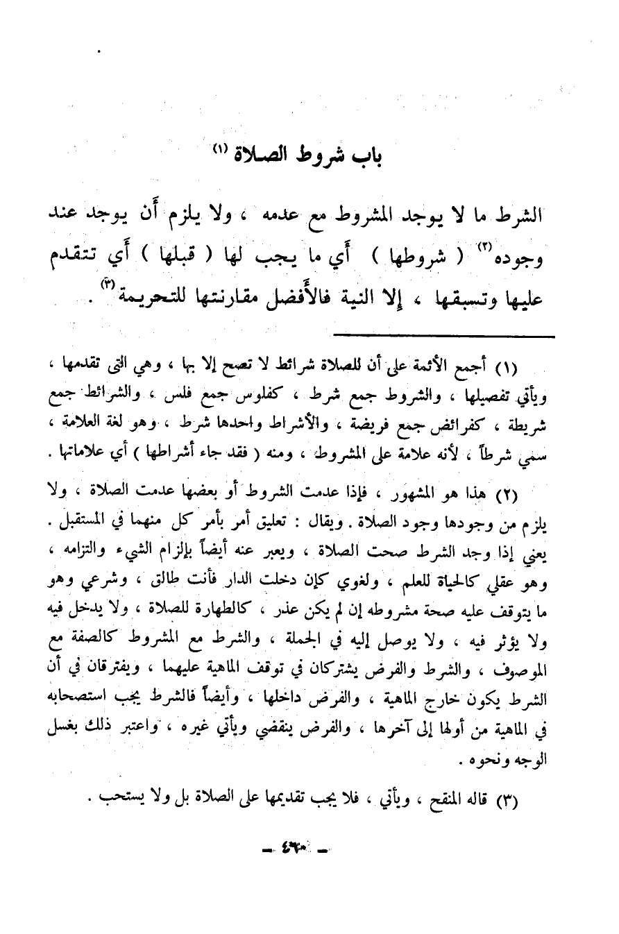 (¬2) هذا هو المشهور فإذا عدمت الشروط أو بعضها عدمت الصلاة، ولا يلزم من وجودها وجود الصلاة، ويقال: تعليق أمر بأمر كل منهما في المستقبل، يعني إذا وجد الشرط صحت الصلاة، ويعبر عنه أيضا بإلزام الشيء والتزامه وهو عقلي كالحياة للعلم، ولغوي كإن دخلت الدار فأنت طالق، وشرعي وهو ما يتوقف عليه صحة مشروطة إن لم يكن عذر، كالطهارة للصلاة، ولا يدخل فيه ولا يؤثر فيه، ولا يوصل إليه في الجملة، والشرط مع المشروط كالصفة مع الموصوف، والشرط والفرض يشتركان في توقف الماهية عليهما، ويفترقان في أن الشرط يكون خارج الماهية، والفرض داخلها، وأيضا فالشرط يجب استصحابه في الماهية من أولها إلى آخرها، والفرض ينقضي ويأتي غيره، واعتبر ذلك بغسل الوجه ونحوه.