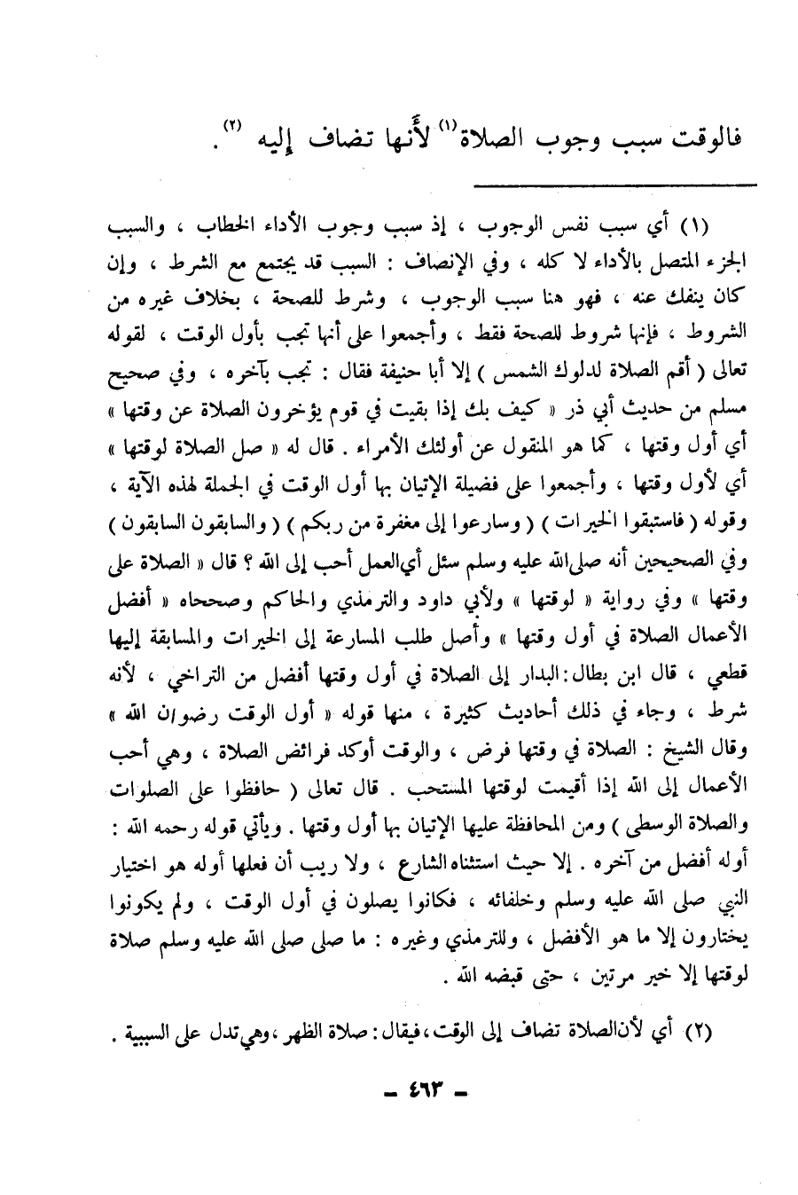 (¬1) أي سبب نفس الوجوب، إذ سبب وجوب الأداء الخطاب، والسبب الجزء المتصل بالأداء لا كله، وفي الإنصاف، السبب قد يجتمع مع الشرط، وإن كان ينفك عنه، فهو هنا سبب الوجوب، وشرط للصحة، بخلاف غيره من الشروط فإنها شروط للصحة فقط، وأجمعوا على أنها تجب بأول الوقت، لقوله تعالى: {أَقِمِ الصَّلاةَ لِدُلُوكِ الشَّمْسِ} إلا أبا حنيفة فقال: تجب بآخره، وفي صحيح مسلم من حديث أبي ذر: كيف بك إذا بقيت في قوم يؤخرون الصلاة عن وقتها أي أول وقتها، كما هو المنقول عن أولئك الأمراء، قال له: صل الصلاة لوقتها، أي لأول وقتها، وأجمعوا على فضيلة الإتيان بها أول الوقت في الجملة لهذه الآية وقوله: {فَاسْتَبِقُوا الْخَيْرَاتِ} {وَسَارِعُوا إِلَى مَغْفِرَةٍ مِنْ رَبِّكُمْ} {وَالسَّابِقُونَ السَّابِقُونَ} وفي الصحيحين أنه صلى الله عليه وسلم «سأل أي العمل أحب إلى الله؟ قال: الصلاة على وقتها» ، وفي رواية لوقتها، ولأبي داود والترمذي والحاكم وصححاه، أفضل الأعمال الصلاة في أول وقتها، وأصل طلب المسارعة إلى الخيرات والمسابقة إليها قطعي، قال ابن بطال: البدار إلى الصلاة في أول وقتها أفضل من التراخي، لأنه شرط، وجاء في ذلك أحاديث كثيرة، منها قوله: أول الوقت رضوان الله، وقال الشيخ: الصلاة في وقتها فرض، والوقت أوكد فرائض الصلاة، وهي أحب الأعمال إلى الله إذا أقيمت لوقتها المستحب، قال تعالى: {حَافِظُوا عَلَى الصَّلَوَاتِ وَالصَّلاةِ الْوُسْطَى} ومن المحافظة عليها الإتيان بها أول وقتها، ويأتي قوله رحمه الله: أوله أفضل من آخره، إلا حيث استثناه الشارع، ولا ريب أن فعلها أوله هو اختيار النبي صلى الله عليه وسلم وخلفائه، فكانوا يصلون في أول الوقت، ولم يكونوا يختارون إلا ما هو الأفضل، والترمذي وغيره: ما صلى صلى الله عليه وسلم صلاة لوقتها إلا خير مرتين، حتى قبضه الله.
