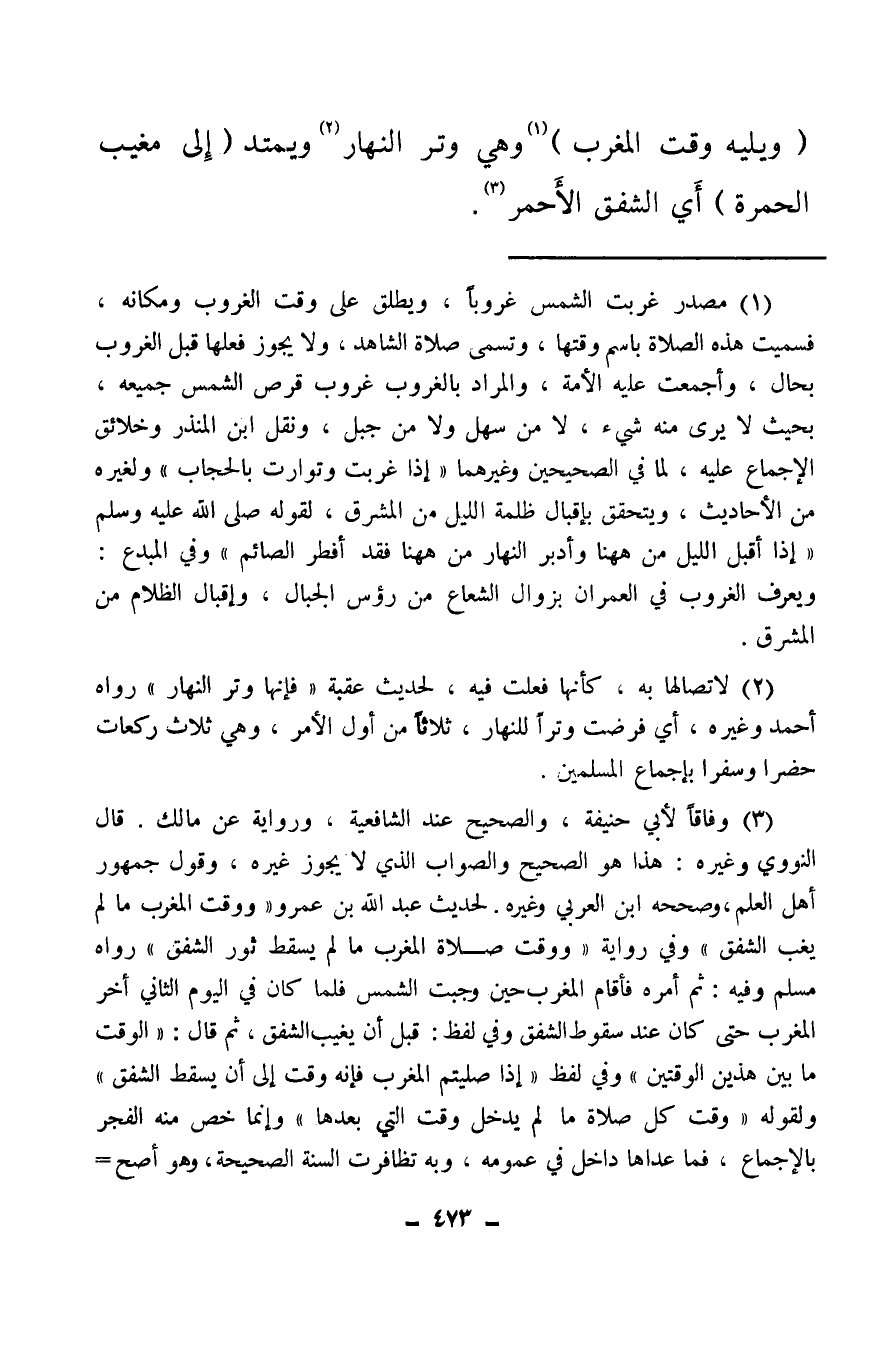 (¬3) وفاقا لأبي حنيفة، والصحيح عند الشافعية، ورواية عن مالك، قال النووي وغيره، هذا هو الصحيح والصواب الذي لا يجوز غيره، وقول جمهور أهل العلم، وصححه ابن العربي وغيره، لحديث عبد الله بن عمرو ووقت المغرب ما لم يغب الشفق، وفي رواية ووقت صلاة المغرب ما لم يسقط ثور الشفق، رواه مسلم وفيه: ثم أمره فأقام المغرب حين وجبت الشمس فلما كان في اليوم الثاني أخر المغرب حتى كان عند سقوط الشفق وفي لفظ، قبل أن يغيب الشفق، ثم قال: الوقت ما بين هذين الوقتين وفي لفظ إذا صليتم المغرب فإنه وقت إلى أن يسقط الشفق ولقوله: وقت كل صلاة ما لم يدخل وقت التي بعدها، وإنما خص منه الفجر بالإجماع، فما عداها داخل في عمومه، وبه تضافرت السنة الصحيحة، وهو أصح