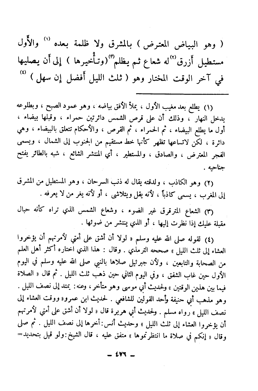 (¬4) لقوله صلى الله عليه وسلم لولا أن أشق على أمتي لأمرتهم أن يؤخروا العشاء إلى ثلث الليل، صححه الترمذي، وقال: هذا الذي اختاره أكثر أهل العلم من الصحابة والتابعين، ولأن جبرئيل صلاها بالنبي صلى الله عليه