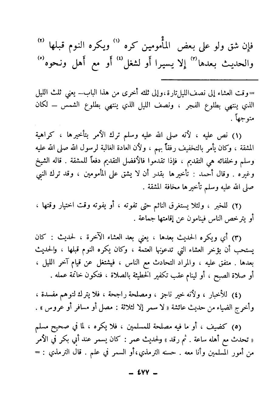 (¬3) أي ويكره الحديث بعدها، يعني بعد العشاء الآخرة، لحديث كان يستحب أن يؤخر العشاء التي تدعونها العتمة، وكان يكره النوم قبلها، والحديث بعدها متفق عليه والمراد التحادث مع الناس، فيشتغل عن قيام آخر الليل، أو صلاة الصبح، أو لينام عقب تكفير الخطيئة بالصلاة فتكون خاتمة عمله.