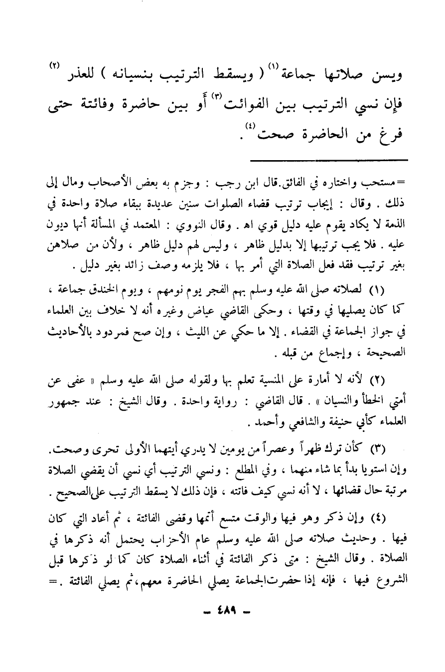 (¬1) لأنها صلوات واجبة تفعل في وقت يتسع لها، فوجب فيها الترتيب. قال الشارح: وهذا الترتيب شرط لصحة الصلاة، فلو أخل به لم تصح، لحديث جابر يوم الخندق «فصلى العصر بعدما غربت الشمس، ثم صلى بعدها المغرب» متفق عليه، ولأحمد: عام الأحزاب صلى المغرب، فلما فرغ قال: «هل علم أحد منكم أني صليت العصر؟» قالوا: يا رسول الله ما صليتها. فأمر المؤذن فأقام الصلاةن فصلى العصر، ثم أعاد المغرب. ولترتيبه الأربع صلوات. وروى عن ابن عمر ومالك وأبي حنيفة وغيرهم وجوب الترتيب، وعنه: لا يجب وفاقًا. وقال في المبهج: مستحب واختاره في الفائق، قال ابن رجب، وجزم به بعض الأصحاب ومال إلى ذلك، وقال: إيجاب ترتيب قضاء الصلوات سنين عديدة ببقاء صلاة واحدة في الذمة لا يكاد يقوم عليه دليل قوي اهـ وقال النووي: المعتمد في المسألة أنها ديون عليه، فلا يجب ترتيبها إلا بدليل ظاهر، وليس لهم دليل ظاهر، ولأن من صلاهن بغير ترتيب فقد فعل الصلاة التي أمر بها، فلا يلزمه وصف زائد بغير دليل.