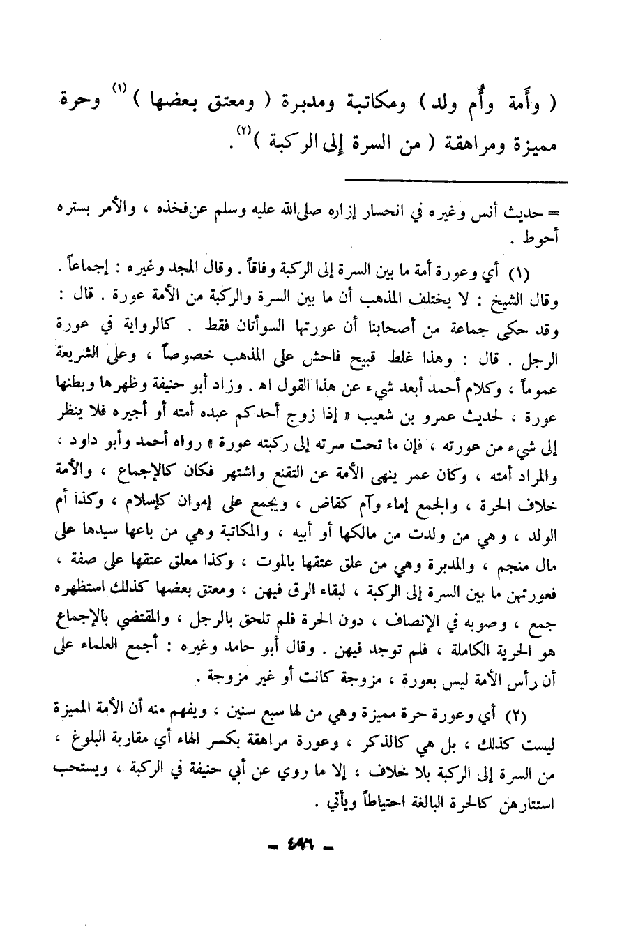(¬5) أي وعورة ذكر بالغ ولو عبدا، وكذا عورة من بلغ عشر سنين حرا كان أو عبدا ما بين السرة والركبة، لحديث علي لا تبرز فخذك ولا تنظر إلى فخذ حي أو ميت، رواه أبو داود وابن ماجه، ولحديث جرهد الأسلمي غط فخذك فإن الفخذ عورة، رواه مالك وأحمد والترمذي وحسنه، وفيه أحاديث أخر، قال الطحاوي: قد جاءت عن النبي صلى الله عليه وسلم آثار متواترة فيها أن الفخذ عورة،