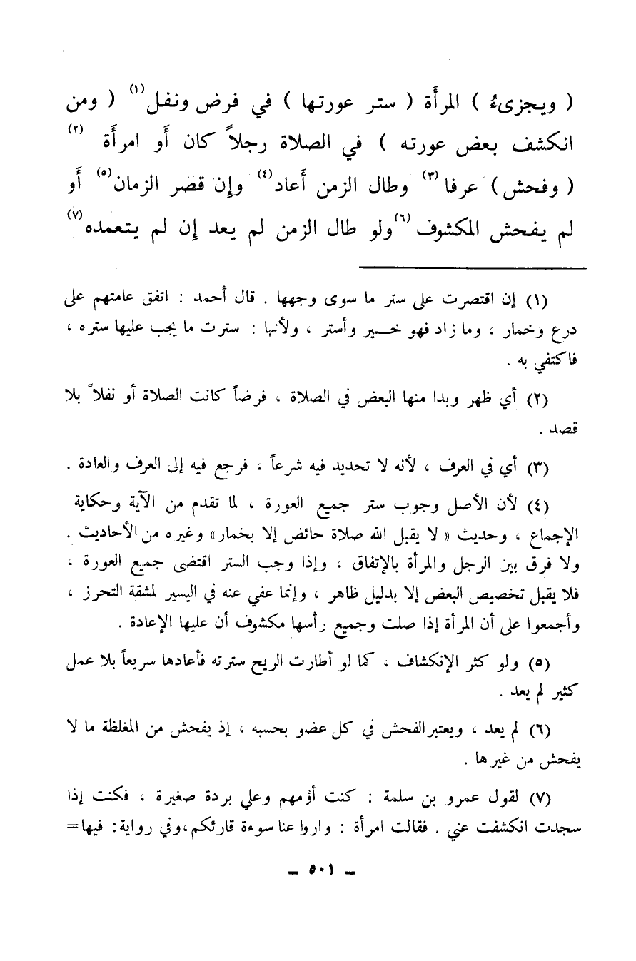 (¬4) بلا حاجة كحضور أجانب، قال ابن عبد البر: أجمعوا على أن على المرأة أن تكشف وجهها في الصلاة، ولأنه يخل بمباشرة المصلي بالجبهة والأنف، والنقاب جمعه نقب، مثل كتاب وكتب، وتنقبت غطت وجهها بالنقاب، وهو القناع على مارن الأنف، تستر به المرأة وجهها، وقال أبو عبيد: النقاب هو الذي يبدو منه محجر العينين، وقال الفراء: إذا أدنت المرأة نقابها إلى عينها فتلك الوصوصة، وإن أنزلت دون لك إلى المحجر فهو النقاب، فإن كان على طرف الأنف فهو اللثام، والبرقع بالفتح والضم خريقة تثقب للعينين، تلبسها نساء الأعراب فتستر الوجه فقط، أو الوجه ومقدم الجسم، جمعه براقع، وتبرقعت المرأة لبست البرقع.