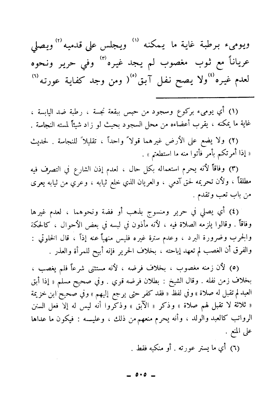 (¬4) أي ولا يعيد من حبس في محل نجس ونحوه، قال في الاختيارات، وكذا كل مكره على الكون بالمكان النجس والغصب، بحيث يخاف ضررا من الخروج في نفسه أو ماله، ينبغي أن يكون كالمجوس، فإن جهل أو نسي كونه مغصوبا أو حريرا صحت، حكاه المجد إجماعا.