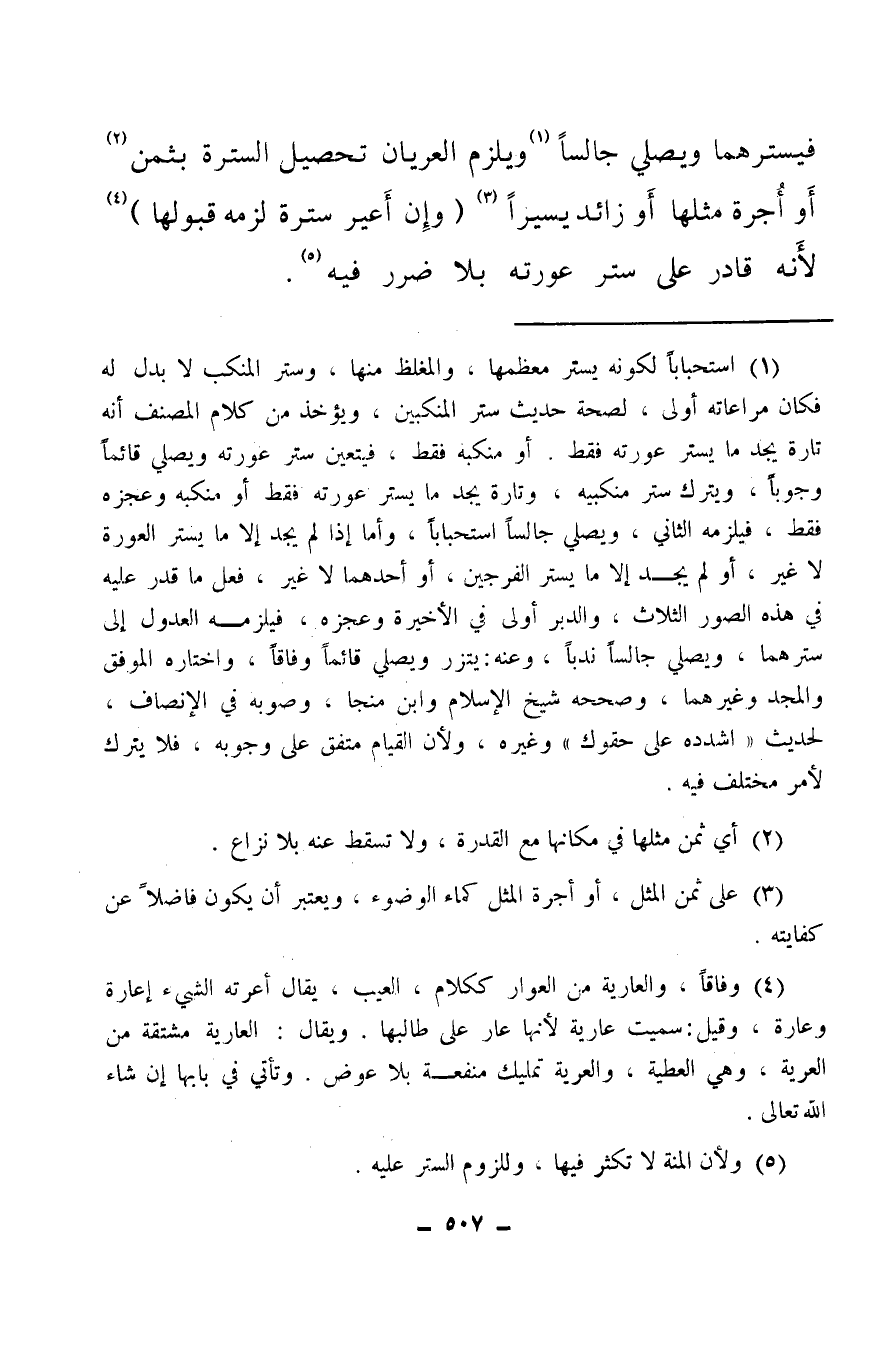 (¬5) بأن كانت إذا تركها على كتفه وسدلها من ورائه تستر عجزه، أو هو مستثنى من قوله: أو الفرجين باعتبار عموم الأحوال، أي ومن لم يجد إلا أن يستر الفرجين سترهما في كل حال، إلا إذا كفت منكبه وعجزه فيلزمه العدول إلى سترهما ويصلي جالسا ندبا، والجمهور على أنه يستر الفرجين فقط، والمنكب مجتمع رأس العضد والكتف، والعجز من الرجل والمرأة ما بين الوركين.