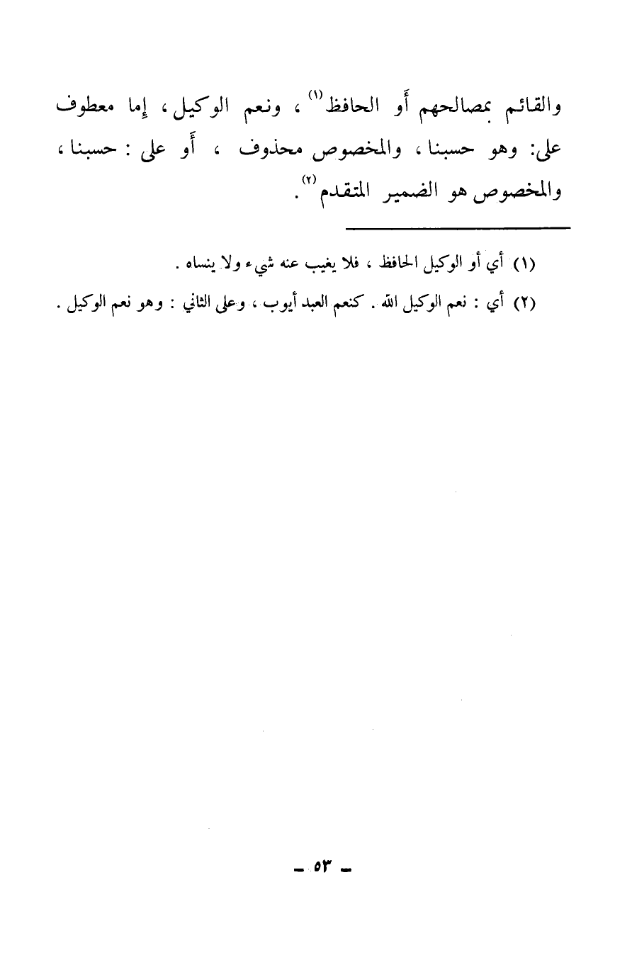 والقائم بمصالحهم أو الحافظ (¬1) ونعم الوكيل إما معطوف على: وهو حسبنا، والمخصوص محذوف، أو على: حسبنا: والمخصوص هو الضمير المتقدم (¬2) .