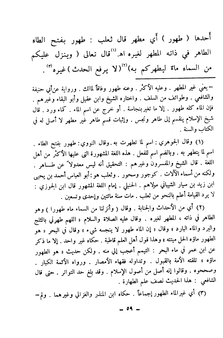 (¬2) أي: من الأحداث والجنابة وقال: {وَأَنْزَلْنَا مِنَ السَّمَاءِ مَاءً طَهُورًا *} وهو الطاهر في ذاته المطهر لغيره، وقال عليه الصلاة والسلام «اللهم طهرني بالثلج والبرد» والماء البارد، وقال: «إن الماء طهور لا ينجسه شيء» وقال في البحر: «هو الطهور ماؤه الحل ميتته» وهذا قول أهل العلم قاطبة حكاه غير واحد، إلا ما ذكر عن ابن عمر في ماء البحر، التيمم أعجب إلي منه، ولكن حديث «هو الطهور ماؤه» تلقته الأمة بالقبول، وتداوله فقهاء الأمصار، ورواه الأئمة الكبار، وصححوه وقالوا: إنه أصل من أصول الإسلام، وقد بلغ حد التواتر، حتى قال الشافعي: هذا الحديث نصف علم الطهارة.