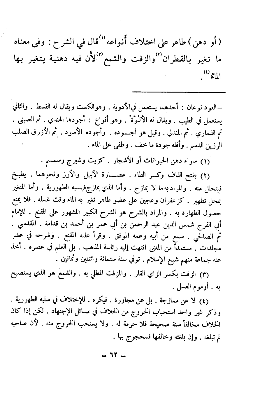 (¬2) بفتح القاف وكسر الطاء، عصارة الأبهل والأرز ونحوهما، يطبخ فيتحلل منه، والمراد به ما لا يمازج، وأما الذي يمازج فيسلبه الطهورية، وأما المتغير بمحل تطهير، كزعفران وعجين على عضو طاهر تغير به الماء وقت غسله، فلا يمنع حصول الطهارة به، والمراد بالشرح هو الشرح الكبير المشهور على المقنع، للإمام أبي الفرج شمس الدين عبد الرحمن بن أبي عمر بن أحمد بن قدامة، المقدسي ثم الصالحي سمع من أبيه وعمه الموفق، وقرأ عليه المقنع، وشرحه في عشر مجلدات مستمدا من المغني انتهت إليه رئاسة المذهب، بل العلم في عصره، أخذ عنه جماعة منهم شيخ الإسلام، توفي سنة ستمائة واثنتين وثمانين.
