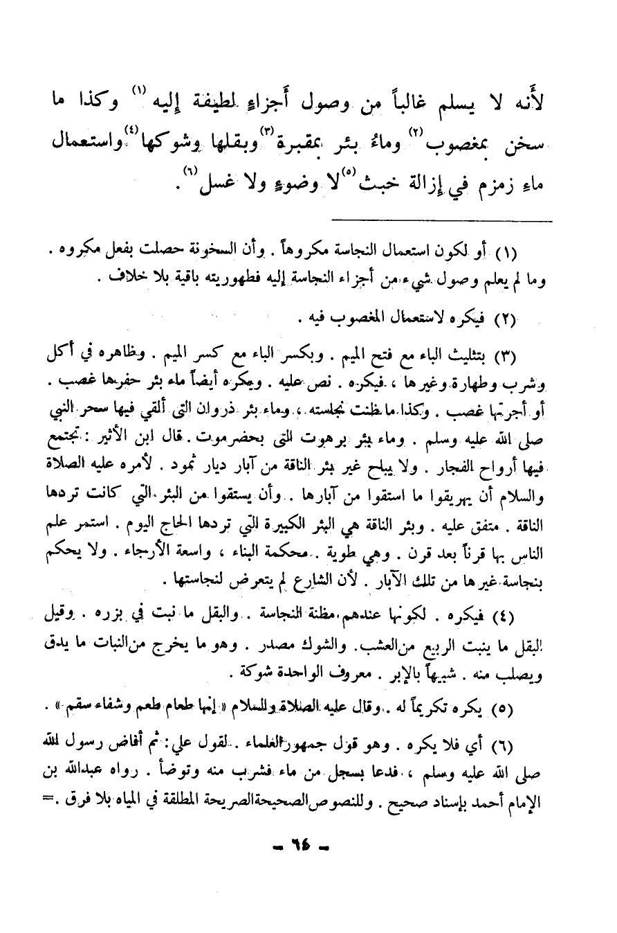 (¬3) بتثليث الباء مع فتح الميم، وبكسر الباء مع كسر الميم، وظاهره في أكل وشرب وطهارة وغيرها، فيكره نص عليه ويكره أيضا ماء بئر حفرها غصب أو أجرتها غصب وكذا ما ظنت نجاسته، وماء بئر ذروان التي ألقي فيها سحر النبي صلى الله عليه وسلم وماء بئر برهوت التي بحضرموت قال ابن الأثير: تجتمع فيها أرواح الفجار، ولا يباح غير بئر الناقة من آبار ديار ثمود، لأمره عليه الصلاة والسلام أن يهريقوا ما استقوا من آبارها، وأن يستقوا من البئر التي كانت تردها الناقة، متفق عليه، وبئر الناقة هي البئر الكبيرة التي تردها الحاج اليوم، استمر علم الناس بها قرنا بعد قرن، وهي طوية محكمة البناء، واسعة الأرجاء، ولا يحكم بنجاسة غيرها من تلك الآبار لأن الشارع لم يتعرض لنجاستها.
