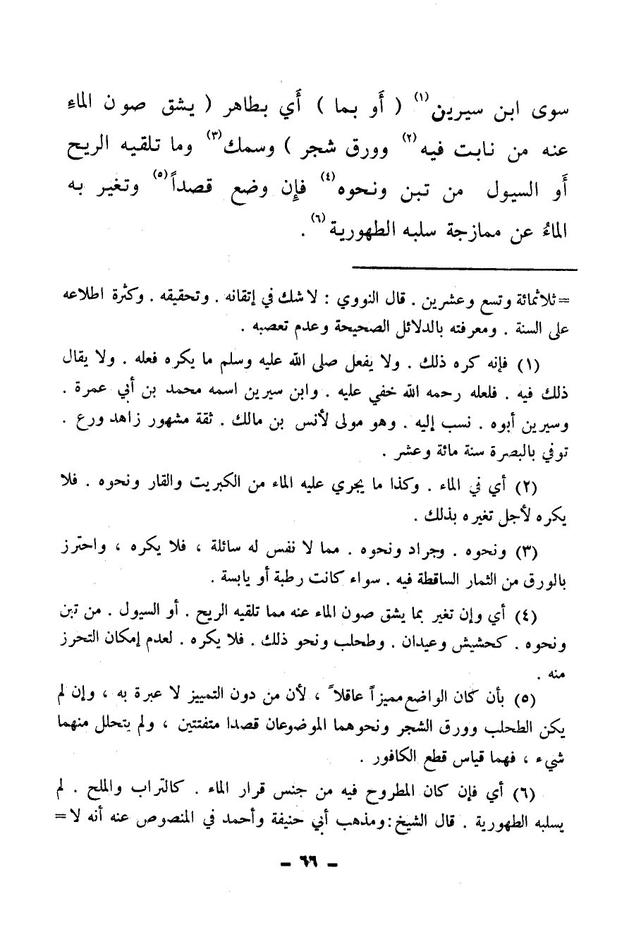 (¬6) أي فإن كان المطروح فيه من جنس قرار الماء، كالتراب والملح، لم يسلبه الطهورية قال الشيخ: ومذهب أبي حنيفة وأحمد في المنصوص عنه أنه لا