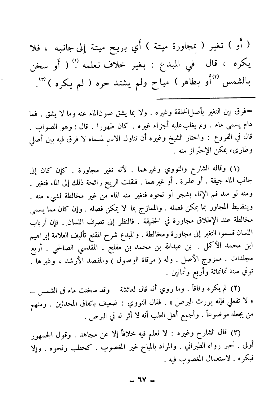 (¬1) وقاله الشارح والنووي وغيرهما، لأنه تغير مجاورة، كإن كان إلى جانب الماء جيفة، أو عذرة أو غيرهما، فنقلت الريح رائحة ذلك إلى الماء فتغير ومنه لو سد فم الإناء بشجر أو نحوه فتغير منه الماء من غير مخالطة لشيء منه وينضبط المجاور بما يمكن فصله، والممازج بما لا يمكن فصله، وإن كان مما يسمى مخالطة عند الإطلاق مجاورة في الحقيقة، فالنظر إلى تصرف اللسان، فإن أرباب اللسان قسموا التغير إلى مجاورة ومخالطة، والمبدع شرح المقنع تأليف العلامة إبراهيم ابن محمد الأكمل، بن عبد الله بن محمد بن مفلح، المقدسي الصالحي، أربع مجلدات ممزوج الأصل وله «مرقاة الوصول» ، والمقصد الأرشد، وغيرها توفي سنة ثمانمائة وأربع وثمانين.