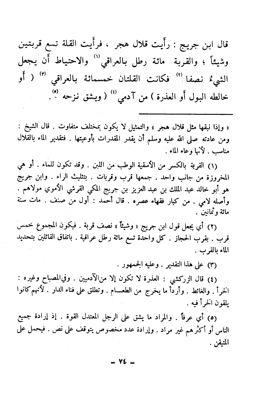 (¬2) أي يجعل قول ابن جريج «وشيئا» نصف قربة، فيكون المجموع خمس قرب بقرب الحجاز كل واحدة تسعمائة رطل عراقية باتفاق القائلين بتحديد الماء بالقرب.