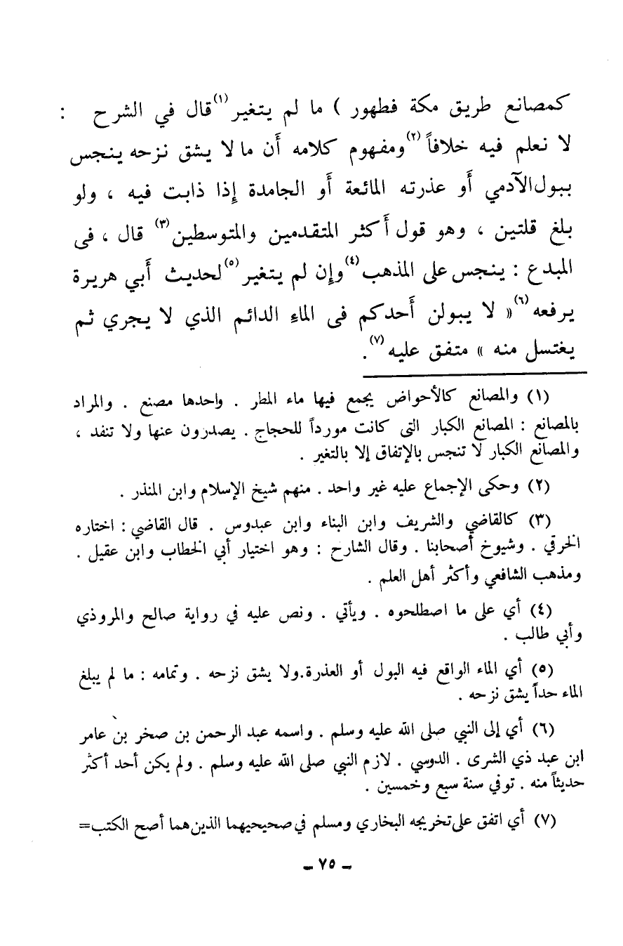 كمصانع طريق مكة فطهور) ما لم يتغير (¬1) قال في الشرح: لا نعلم فيه خلافًا (¬2) ومفهوم كلامه أن ما لا يشق نزحه ينجس ببول الآدمي أو عذرته المائعة أو الجامدة إذا ذابت فيه، ولو بلغ قلتين، وهو قول أكثر المتقدمين والمتوسطين (¬3) قال في المبدع: ينجس على المذهب (¬4) وإن لم يتغير (¬5) لحديث أبي هريرة يرفعه (¬6) : «لا يبولن أحدكم في الماء الدائم الذي لا يجري ثم يغتسل منه» متفق عليه (¬7) .