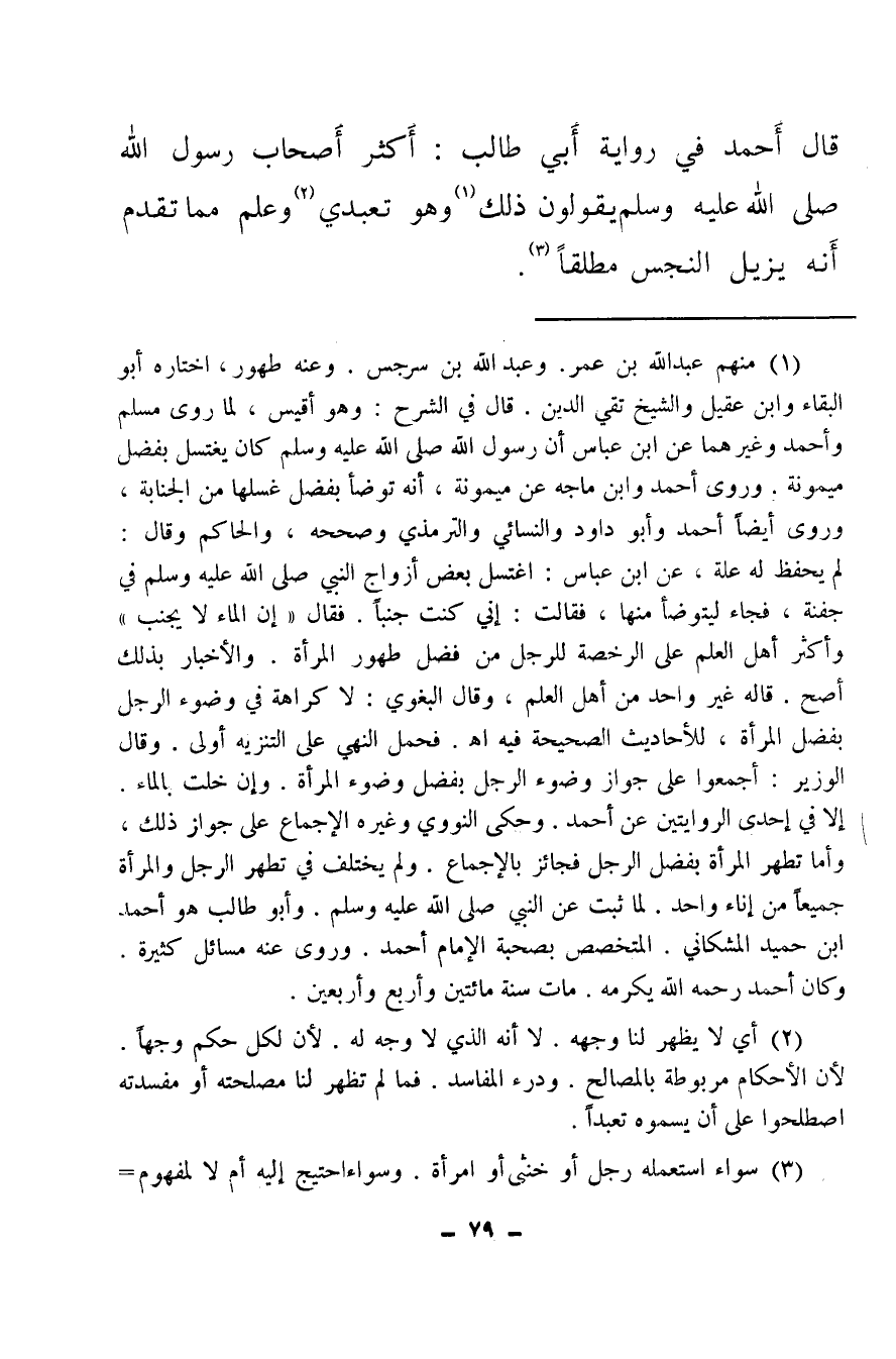 (¬1) منهم عبد الله بن عمر. وعبد الله بن سرجس، وعنه طهور، اختاره أبو البقاء وابن عقيل والشيخ تقي الدين قال في الشرح: وهو أقيس، لما روى مسلم وأحمد وغيرهما عن ابن عباس أن رسول الله صلى الله عليه وسلم (كان يغتسل بفضل ميمونة) ، وروى أحمد وابن ماجه عن ميمونة، (أنه توضأ بفضل غسلها من الجنابة) ، وروى أيضا أحمد وأبو داود والنسائي والترمذي وصححه، والحاكم وقال: لم يحفظ له علة، عن ابن عباس: (اغتسل بعض أزواج النبي صلى الله عليه وسلم في جفنة، فجاء ليتوضأ منها، فقالت: إني كنت جنبا، فقال: إن الماء لا يجنب) وأكثر أهل العلم على الرخصة للرجل من فضل طهور المرأة، والأخبار بذلك أصح، قاله غير واحد من أهل العلم، وقال البغوي: لا كراهة في وضوء الرجل بفضل المرأة، للأحاديث الصحيحة فيه اهـ، فحمل النهي على التنزيه أولى، وقال الوزير، أجمعوا على جواز وضوء الرجل بفضل وضوء المرأة، وإن خلت بالماء إلا في إحدى الروايتين عن أحمد، وحكى النووي وغيره الإجماع على جواز ذلك وأما تطهر المرأة بفضل الرجل فجائز بالإجماع، ولم يختلف في تطهر الرجل والمرأة جميعا من إناء واحد، لما ثبت عن النبي صلى الله عليه وسلم، وأبو طالب هو أحمد بن حميد المشكاني، المتخصص بصحبة الإمام أحمد، وروى عنه مسائل كثيرة، وكان أحمد رحمه الله يكرمه، مات سنة مائتين وأربع وأربعين.