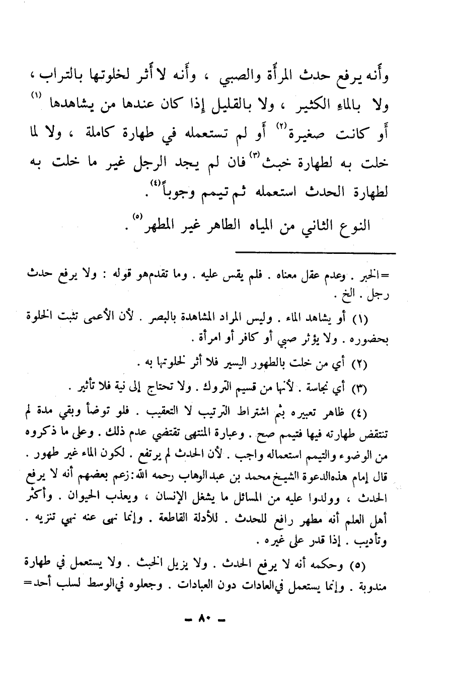 (¬4) ظاهر تعبيره بثم اشتراط الترتيب لا التعقيب، فلو توضأ وبقي مدة لم تنتقض طهارته فيها فتيمم صح، وعبارة المنتهى تقتضي عدم ذلك، وعلى ما ذكروه من الوضوء والتيمم استعماله واجب، لأن الحدث لم يرتفع، لكون الماء غير طهور، قال إمام هذه الدعوة الشيخ محمد بن عبد الوهاب رحمه الله: زعم بعضهم أنه لا يرفع الحدث، وولدوا عليه من المسائل ما يشغل الإنسان، ويعذب الحيوان، وأكثر أهل العلم أنه مطهر رافع للحدث، للأدلة القاطعة، وإنما نهى عنه نهي تنزيه وتأديب إذا قدر على غيره.