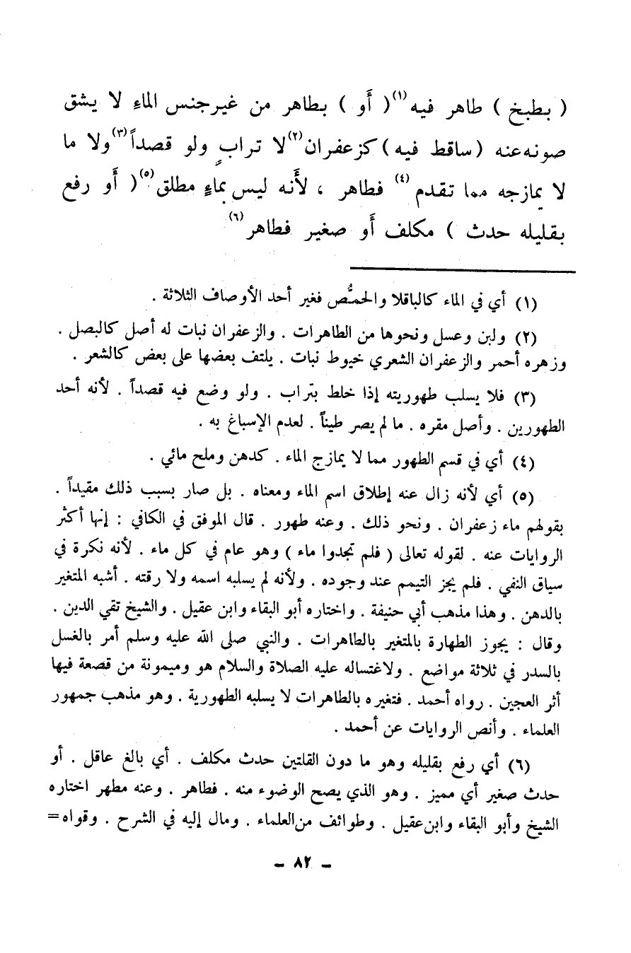 (¬6) أي رفع بقليله وهو ما دون القلتين حدث مكلف أي بالغ عاقل، أو حدث صغير أي مميز وهو الذي يصح الوضوء منه، فطاهر وعنه مطهر اختاره الشيخ وأبو البقاء وابن عقيل، وطوائف من العلماء، ومال إليه في الشرح وقواه
