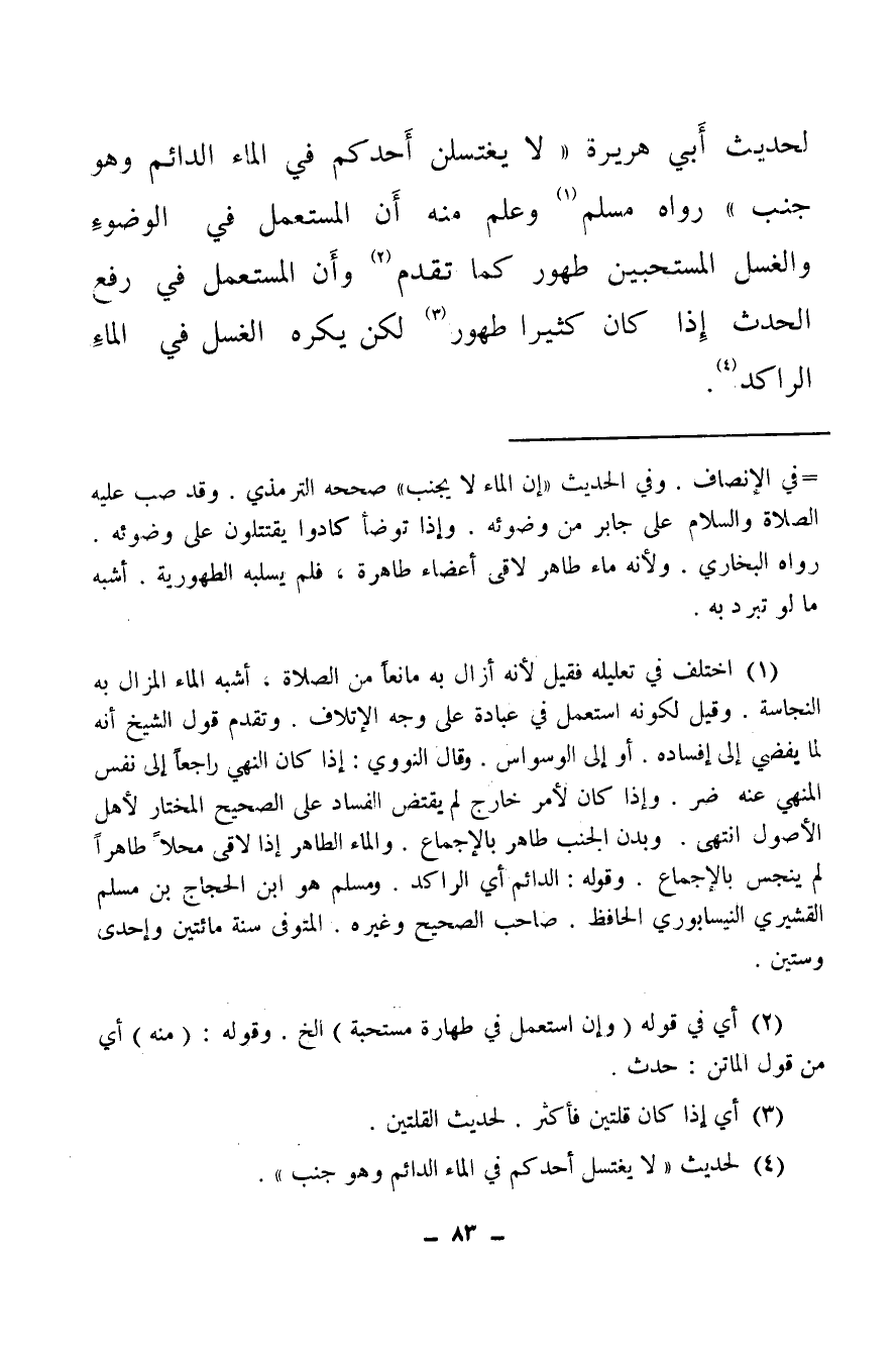(¬1) اختلف في تعليله فقيل لأنه أزال به مانعا من الصلاة، أشبه الماء المزال به النجاسة، وقيل لكونه استعمل في عبادة على وجه الإتلاف، وتقدم قول الشيخ أنه لما يفضي إلى إفساده، أو إلى الوسواس، وقال النووي: إذا كان النهي راجعا إلى النفس المنهي عنه ضر، وإذا كان لأمر خارج لم يقتض الفساد على الصحيح المختار لأهل الأصول انتهى، وبدن الجنب طاهر بالإجماع، والماء الطاهر إذا لاقى محلا طاهرا لم ينجس بالإجماع، وقوله: الدائم أي الراكد، ومسلم هو ابن الحجاج بن مسلم القشيري النيسابوري الحافظ، صاحب الصحيح وغيره، المتوفى سنة مائتين وإحدى وستين.