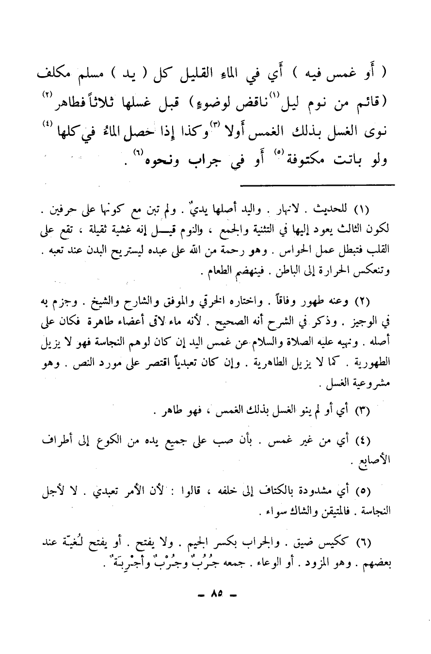 (أو غمس فيه) أي في الماء القليل كل (يد) مسلم مكلف (قائم من نوم ليل (¬1) ناقض لوضوء) قبل غسلها ثلاثا فطاهر (¬2) نوى الغسل بذلك الغمس أو لا (¬3) وكذا إذا حصل الماء في كلها (¬4) ولو باتت مكتوفة (¬5) أو في جراب ونحوه (¬6) .