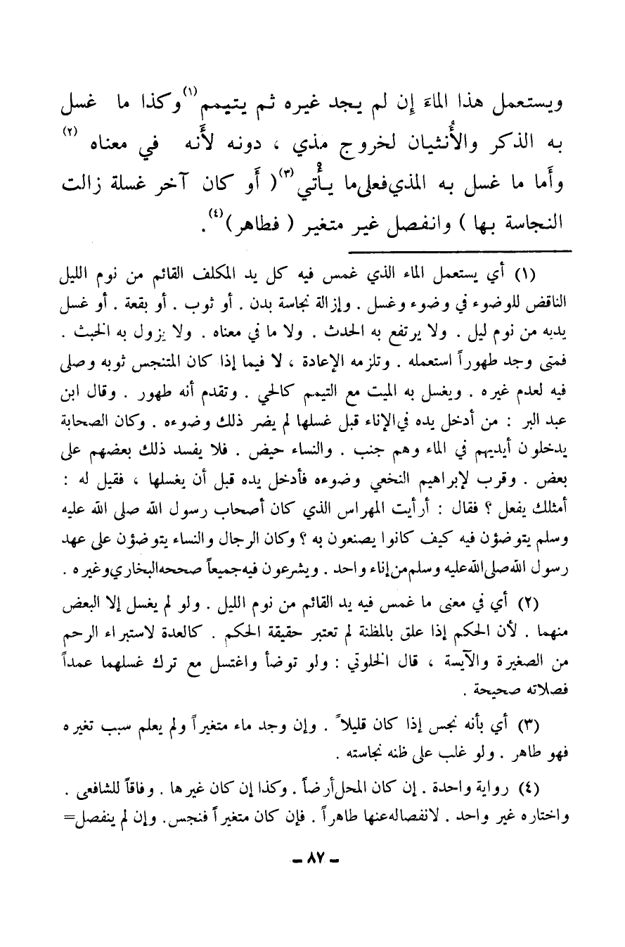 (¬1) أي يستعمل الماء الذي غمس فيه كل يد المكلف القائم من نوم الليل الناقض للوضوء في وضوء وغسل، وإزالة نجاسة بدن، أو ثوب، أو بقعة، أو غسل يديه من نوم ليل، ولا يرتفع به الحدث، ولا ما في معناه، ولا يزول به الخبث، فمتى وجد طهورا استعمله، وتلزمه الإعادة، لا فيما إذا كان المتنجس ثوبه وصلى فيه لعدم غيره، ويغسل به الميت مع التيمم كالحي، وتقدم أنه طهور، وقال ابن عبد البر: من أدخل يده في الإناء قبل غسلها لم يضر ذلك وضوءه، وكان الصحابة يدخلون أيديهم في الماء وهم جنب، والنساء حيض فلا يفسد ذلك بعضهم على بعض، وقرب لإبراهيم النخعي وضوءه فأدخل يده قبل أن يغسلها، فقيل له: أمثلك يفعل؟ فقال: أرأيت المهراس الذي كان أصحاب رسول الله صلى الله عليه وسلم يتوضئون فيه كيف كانوا يصنعون به؟ وكان الرجال والنساء يتوضئون على عهد رسول الله صلى الله عليه وسلم من إناء واحد، ويشرعون فيه جميعا صححه البخاري وغيره.