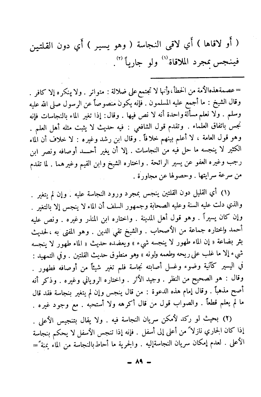 (¬1) أي القليل دون القلتين ينجس بمجرد ورود النجاسة عليه، وإن لم يتغير والذي دلت عليه السنة وعليه الصحابة وجمهور السلف أن الماء لا ينجس إلا بالتغير وإن كان يسيرا، وهو قول أهل المدينة، واختاره ابن المنذر وغيره، ونص عليه أحمد واختاره جماعة من الأصحاب، والشيخ تقي الدين، وهو المفتي به، لحديث بئر بضاعة (إن الماء طهور لا ينجسه شيء) ، ويعضده حديث (الماء طهور لا ينجسه شيء إلا ما غلب على ريحه وطعمه ولونه) ، وهو منطوق حديث القلتين وفي التمهيد في اليسير كآنية وضوء وغسل أصابته نجاسة فلم تغير شيئا من أوصافه فطهور، وقال: هو الصحيح من النظر، وجيد الأثر، واختاره الروياني وغيره، وذكر أنه أصح مذهبا، وقال إمام هذه الدعوة، من قال ينجس وإن لم يتغير بنجاسة فقد قال ما لم يعلم قطعا، والصواب قول من قال أكرهه ولا أستحبه، مع وجود غيره.
