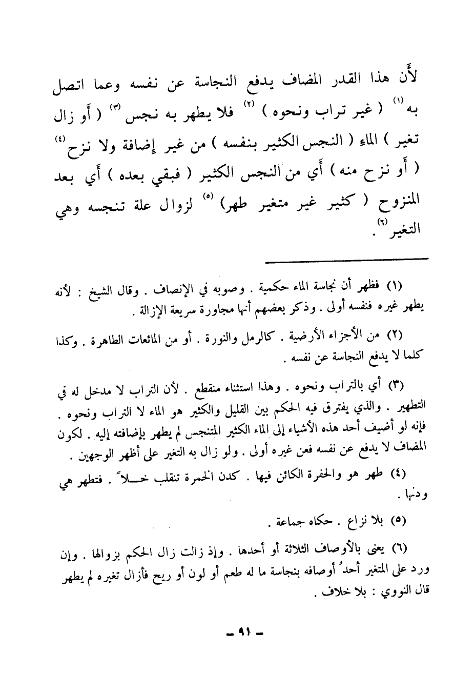 (¬6) يعني بالأوصاف الثلاثة أو أحدها، وإذ زالت زال الحكم بزوالها، وإن ورد على المتغير أحد أوصافه بنجاسة ما له طعم أو لون أو ريح فأزال تغيره لم يطهر قال النووي: بلا خلاف.