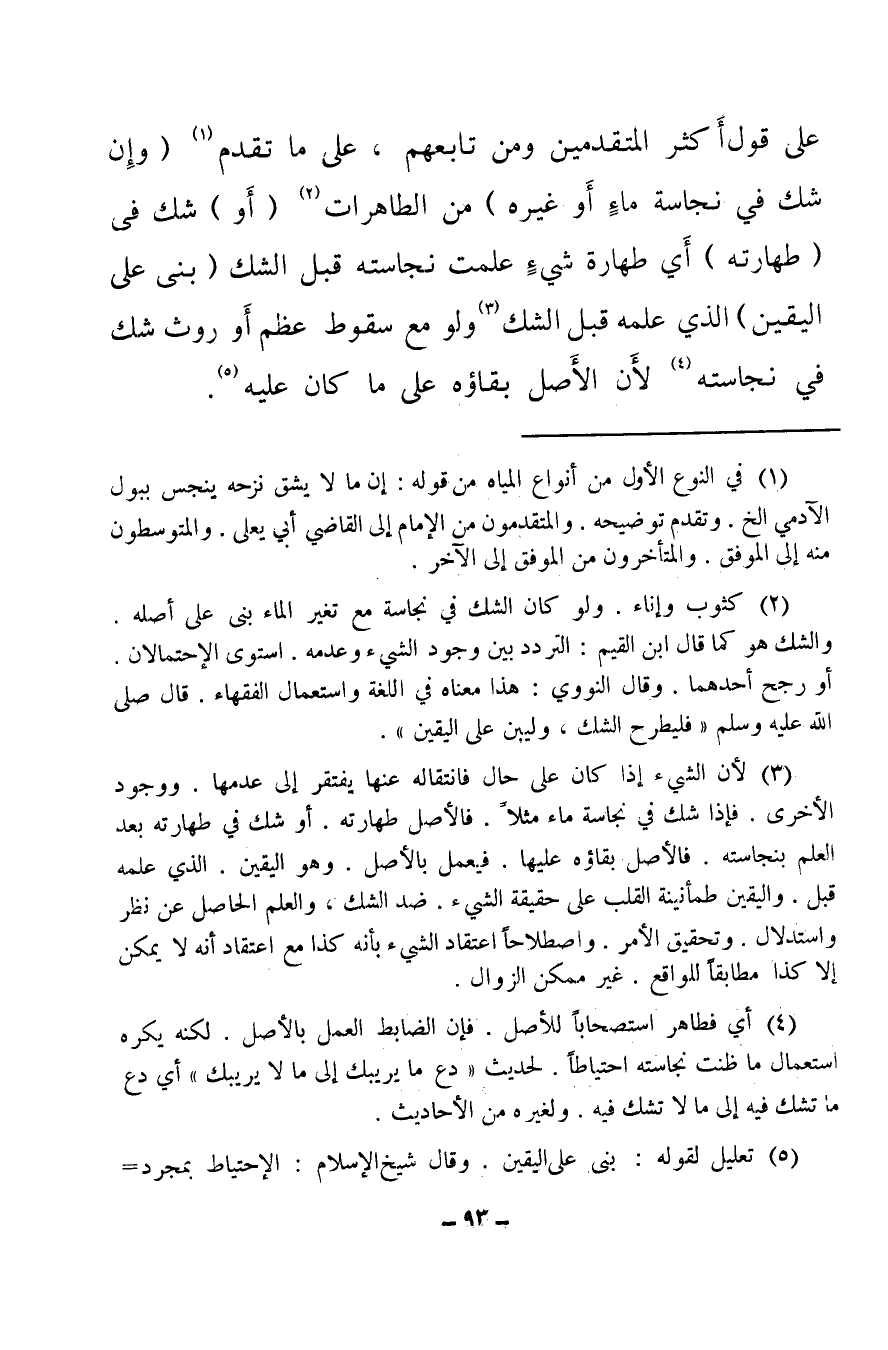 (¬3) لأن الشيء إذا كان على حال فانتقاله عنها يفتقر إلى عدمها ووجود الأخرى فإذا شك في نجاسة ماء مثلا، فالأصل طهارته، أو شك في طهارته بعد العلم بنجاسته، فالأصل بقاؤه عليها، فيعمل بالأصل، وهو اليقين، الذي علمه قبل، واليقين طمأنينة القلب على حقيقة الشيء، ضد الشك، والعلم الحاصل عن نظر واستدلال، وتحقيق الأمر، واصطلاحا اعتقاد الشيء بأنه كذا مع اعتقاد أنه لا يمكن إلا كذا مطابقا للواقع، غير ممكن الزوال.