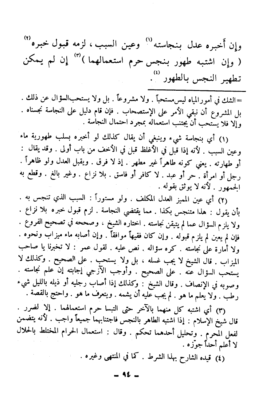 (¬2) أي عين المميز العدل المكلف، ولو مستورا، السبب الذي تنجس به بأن يقول: هذا متنجس بكذا، مما يقتضي النجاسة، لزم قبول خبره بلا نزاع ولا يلزم السؤال عما لم يتيقن نجاسته، اختاره الشيخ، وصححه في تصحيح الفروع، فإن لم يعين لم يلزم قبوله، وإن كان فقيها موافقا، وإن أصابه ماء ميزاب ونحوه، ولا أمارة على نجاسته، كره سؤاله نص عليه لقول عمر: لا تخبرنا يا صاحب الميزاب، قال الشيخ لا يجب غسله، بل ولا يستحب، على الصحيح، وكذلك لا يستحب السؤال عنه، على الصحيح، وأوجب الآزجي إجابته إن علم نجاسته وصوبه في الإنصاف، وقال الشيخ وكذلك إذا أصاب رجليه أو ذيله بالليل شيء رطب، ولا يعلم ما هو، ولم يجب عليه أن يشمه، ويتعرف ما هو واحتج بالقصة.