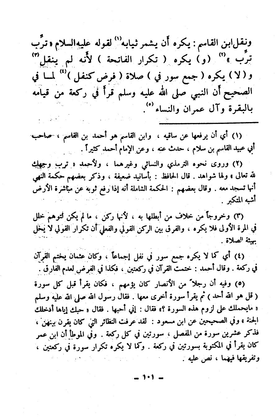 (¬5) وفيه أن رجلا من الأنصار كان يؤمهم فكان يقرأ قبل كل سورة (قل هو الله أحد) ثم يقرأ سورة أخرى معها، فقال رسول الله صلى الله عليه وسلم «ما يحملك على لزوم هذه السورة؟» فقال: إني أحبها، فقال: «حبك إياها أدخلك الجنة» ، وفي الصحيحين عن ابن مسعود لقد عرفت النظائر التي كان يقرن بينهن فذكر عشرين سورة من المفصل، سورتين في كل ركعة، وفي الموطأ أن ابن عمر كان يقرأ في المكتوبة بسورتين في ركعة، وكما لا يكره تكرار سورة في ركعتين وتفريقها فيهما نص عليه.