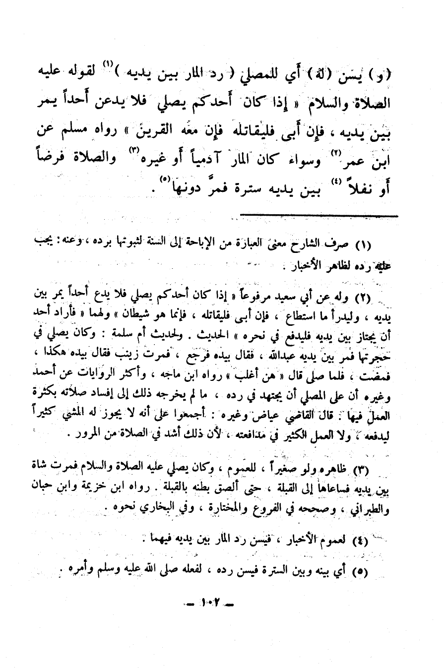 (¬5) أي بينه وبين السترة فيسن رده، لفعله صلى الله عليه وسلم وأمره.