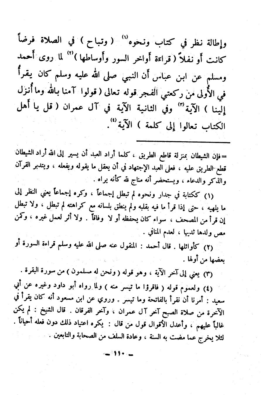 وإطالة نظر في كتاب ونحوه (¬1) (وتباح) في الصلاة فرضًا كانت أو نفلا (قراءة أواخر السور وأوساطها) (¬2) لما روى أحمد ومسلم عن ابن عباس أن النبي صلى الله عليه وسلم كان يقرأ في الأولى من ركعتي الفجر قوله تعالى: {قُولُوا آمَنَّا بِاللهِ وَمَا أُنْزِلَ إِلَيْنَا} الآية (¬3) وفي الثانية الآية في آل عمران {قُلْ يَا أَهْلَ الْكِتَابِ تَعَالَوْا إِلَى كَلِمَةٍ} الآية (¬4) .