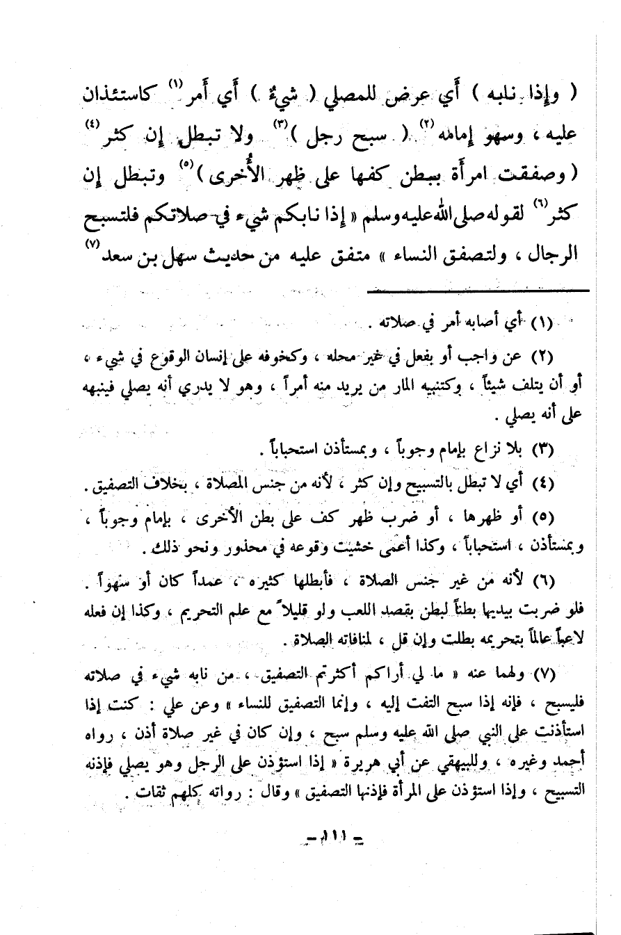 (¬7) ولهما عنه «ما لي أراكم أكثرتم التصفيق، من نابه شيء في صلاته فليسبح فإنه إذا سبح التفت إليه، وإنما التصفيق للنساء» ، وعن علي: كنت إذا استأذنت على النبي صلى الله عليه وسلم سبح، وإن كان في غير صلاة أذن رواه أحمد وغيره، وللبيهقي عن أبي هريرة «إذا استؤذن على الرجل وهو يصلي فإذنه التسبيح وإذا استؤذن على المرأة فإذنها التصفيق» وقال: رواته كلهم ثقات.