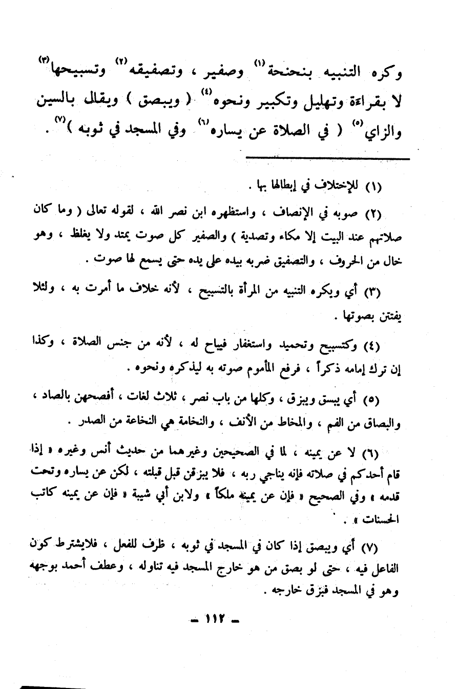 (¬2) صوبه في الإنصاف واستظهره ابن نصر الله، لقوله تعالى: {وَمَا كَانَ صَلاتُهُمْ عِنْدَ الْبَيْتِ إِلا مُكَاءً وَتَصْدِيَةً} والصفير كل صوت يمتد ولا يغلظ، وهو خالٍ من الحروف، والتصفيق ضربه بيده على يده حتى يسمع لها صوت.