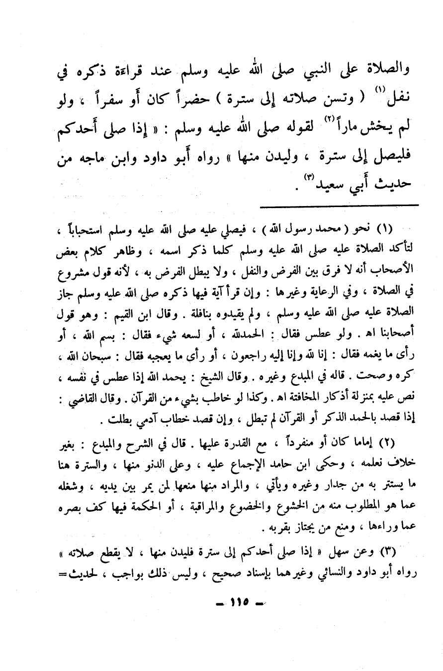 والصلاة على النبي صلى الله عليه وسلم عند قراءة ذكره في نفل (¬1) «وتسن صلاته إلى سترة» حضرًا كان أو سفرًا، ولو لم يخش مارًّا (¬2) لقوله صلى الله عليه وسلم: «إذا صلى أحدكم فليصل إلى سترة، وليدن منها» رواه أبو داود وابن ماجه من حديث أبي سعيد (¬3) .