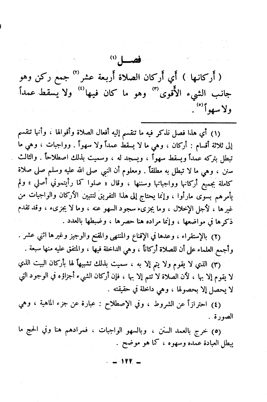 (أركانها) أي أركان الصلاة أربعة عشر (¬2) جمع ركن وهو جانب الشيء الأقوى (¬3) وهو ما كان فيها (¬4) ولا يسقط عمدا ولا سهوا (¬5) .
