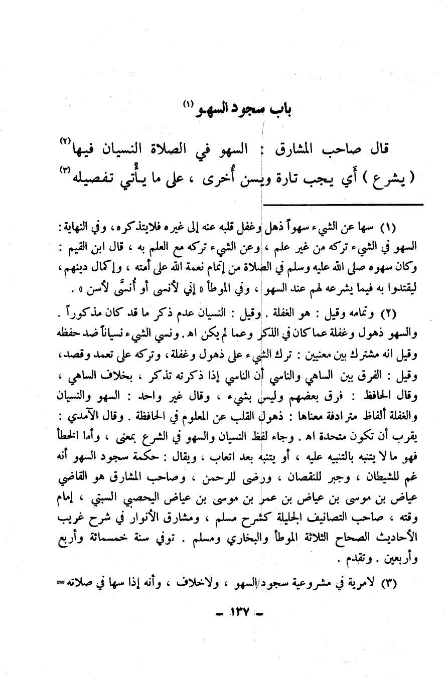 (¬2) وتمامه وقيل: هو الغفلة، وقيل: النسيان عدم ذكر ما قد كان مذكورا والسهو ذهول وغفلة، عما كان في الذكر وعما لم يكن اهـ ونسي الشيء نسيانا ضد حفظه وقيل إنه مشترك بين معنيين: ترك الشيء على ذهول وغفلة وتركه على تعمد وقصد، وقيل: الفرق بين الساهي والناسي أن الناسي إذا ذكرته تذكر، بخلاف الساهي، وقال الحافظ: فرق بعضهم وليس بشيء، وقال غير واحد: السهو والنسيان والغفلة ألفاظ مترادفة معناها: ذهول القلب عن المعلوم في الحافظة، وقال الآمدي: يقرب أن تكون متحدة اهـ وجاء لفظ النسيان والسهو في الشرع بمعنى، وأما الخطأ فهو ما لا يتنبه بالتنبيه عليه، أو يتنبه بعد اتعاب، ويقال: حكمة سجود السهو أنه غم للشيطان، وجبر للنقصان، ورضى للرحمن، وصاحب المشارق، هو القاضي عياض بن موسى بن عياض بن عمر بن موسى بن عياض اليحصبي السبتي، إمام وقته، صاحب التصانيف الجليلة كشرح مسلم، ومشارق الأنوار في شرح غريب الأحاديث الصحاح الثلاثة الموطأ والبخاري ومسلم، توفي سنة خمسمائة وأربع وأربعين وتقدم.