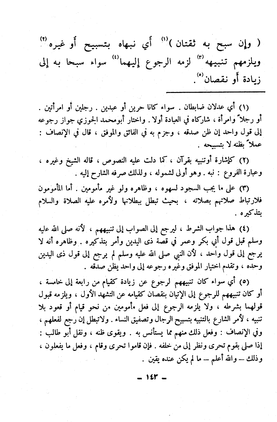 (¬4) هذا جواب الشرط ليرجع إلى الصواب إلى تنبيههم لأنه صلى الله عليه وسلم قبل قول أبي بكر وعمر في قصة ذي اليدين وأمر بتذكيره، وظاهره أنه لا يرجع إلى قول واحد، لأن النبي صلى الله عليه وسلم لم يرجع إلى قول ذي اليدين وحده، وتقدم اختيار الموفق وغيره رجوعه إلى واحد يظن صدقه.