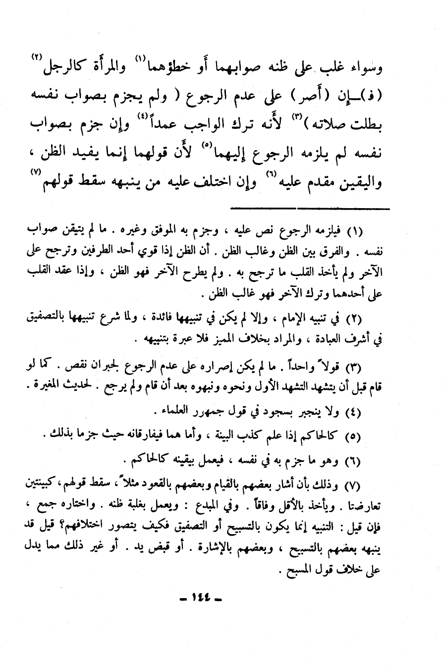 وسواء غلب على ظنه صوابهما أو خطؤهما (¬1) والمرأة كالرجل (¬2) (فـ) إن (أصر) على عدم الرجوع (ولم يجزم بصواب نفسه بطلتا صلاته) (¬3) لأنه ترك الواجب عمدا (¬4) وإن جزم بصواب نفسه لم يلزمه الرجوع إليهما (¬5) لأن قولهما إنما يفيد الظن، واليقين مقدم عليه (¬6) وإن اختلف عليه من ينبهه سقط قولهم (¬7) .