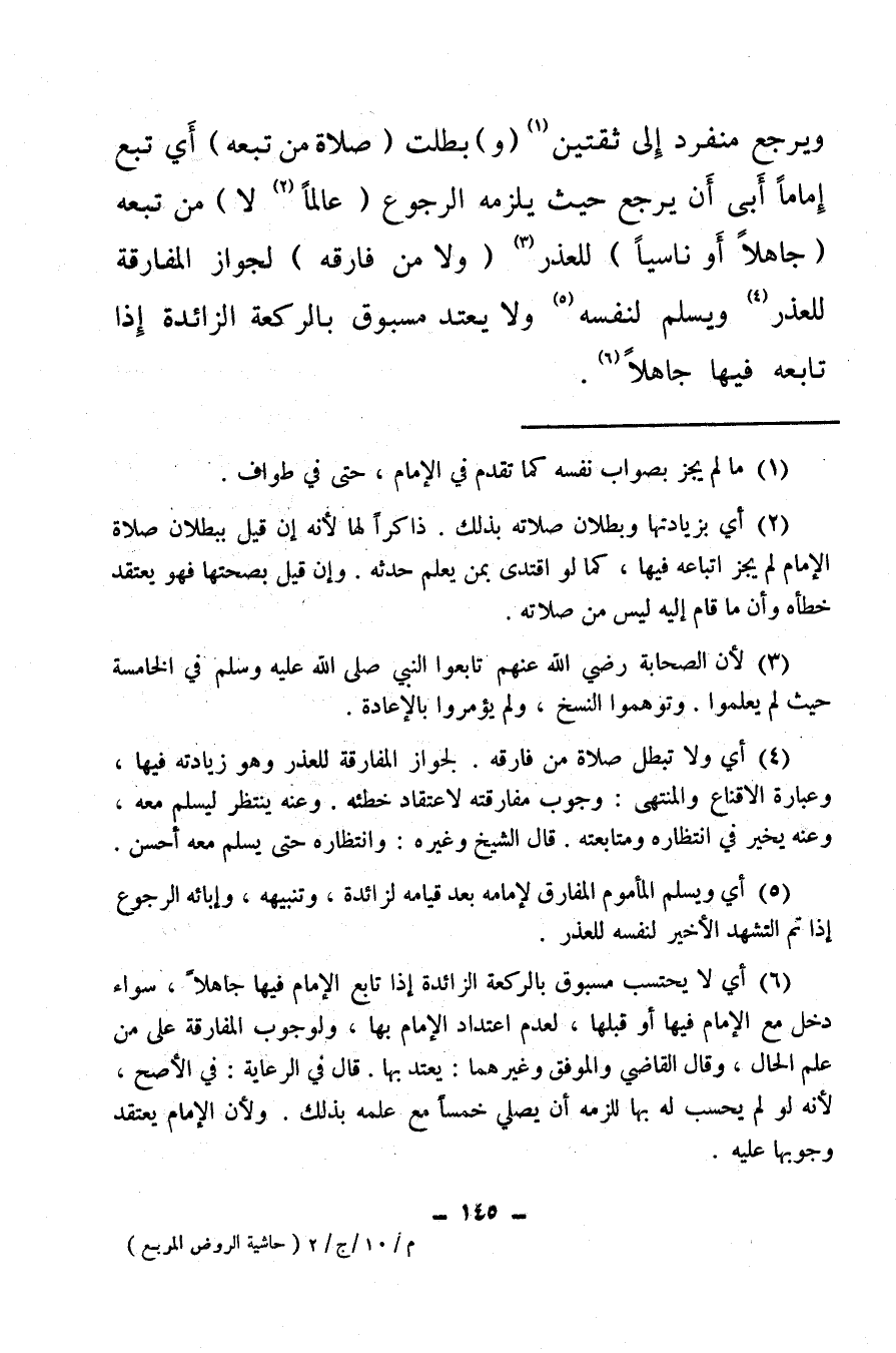 (¬6) أي لا يحتسب مسبوق بالركعة الزائدة إذا تابع الإمام فيها جاهلا، سواء دخل مع الإمام فيها أو قبلها، لعدم اعتداد الإمام بها ولوجوب المفارقة على من علم الحال، وقال القاضي والموفق وغيرهما، يعتد بها، قال في الرعاية: في الأصح، لأنه لو لم يحسب له بها للزمة أن يصلي خمسا مع علمه بذلك، ولأن الإمام يعتقد وجوبها عليه.