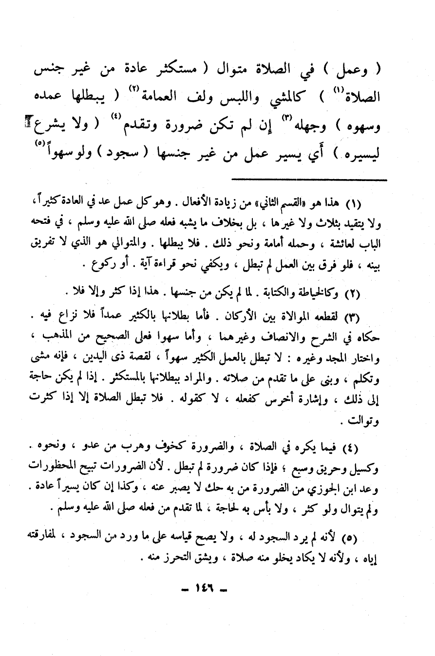 (وعمل) في الصلاة متوال (مستكثر عادة من غير جنس الصلاة (¬1)) كالمشي واللبس ولف العمامة (¬2) (يبطلها عمده وسهوه) وجهله (¬3) إن لم تكن ضرورة وتقدم (¬4) (ولا يشرع ليسيره) أي يسير عمل من غير جنسها (سجود) ولو سهوا (¬5) .