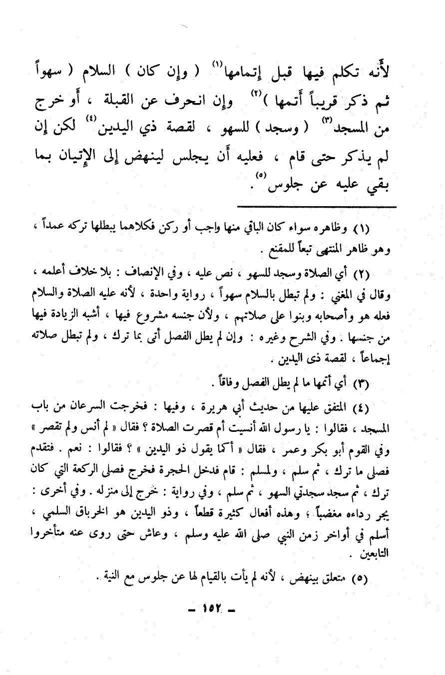 لأنه تكلم فيها قبل إتمامها (¬1) (وإن كان) السلام (سهوا ثم ذكر قريبًا أتمها) (¬2) وإن انحرف عن القبلة، أو خرج من المسجد (¬3) (وسجد) للسهو لقصة ذي اليدين (¬4) لكن إن لم يذكر حتى قام، فعليه أن يجلس لينهض إلى الإتيان بما بقي عليه عن جلوس (¬5) .
