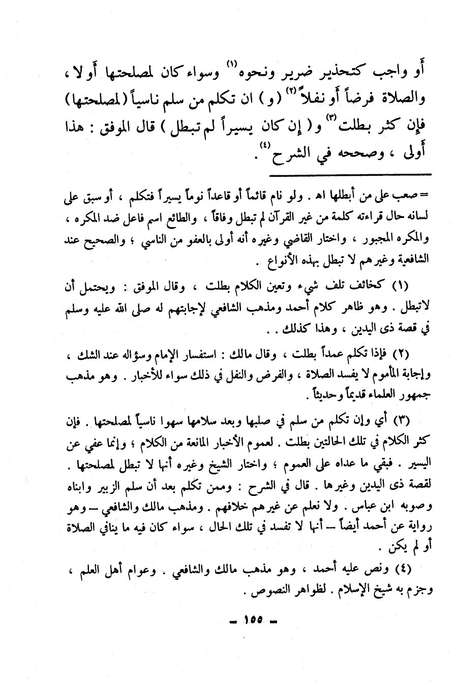 أو واجب كتحذير ضرير ونحوه (¬1) وسواء كان لمصلحتها أو لا والصلاة فرضا أو نفلا (¬2) (و) إن تكلم من سلم ناسيا (لمصلحتها) فإن كثر بطلت (¬3) و (إن كان يسيرا لم تبطل) قال الموفق: هذا أولى، وصححه في الشرح (¬4) .