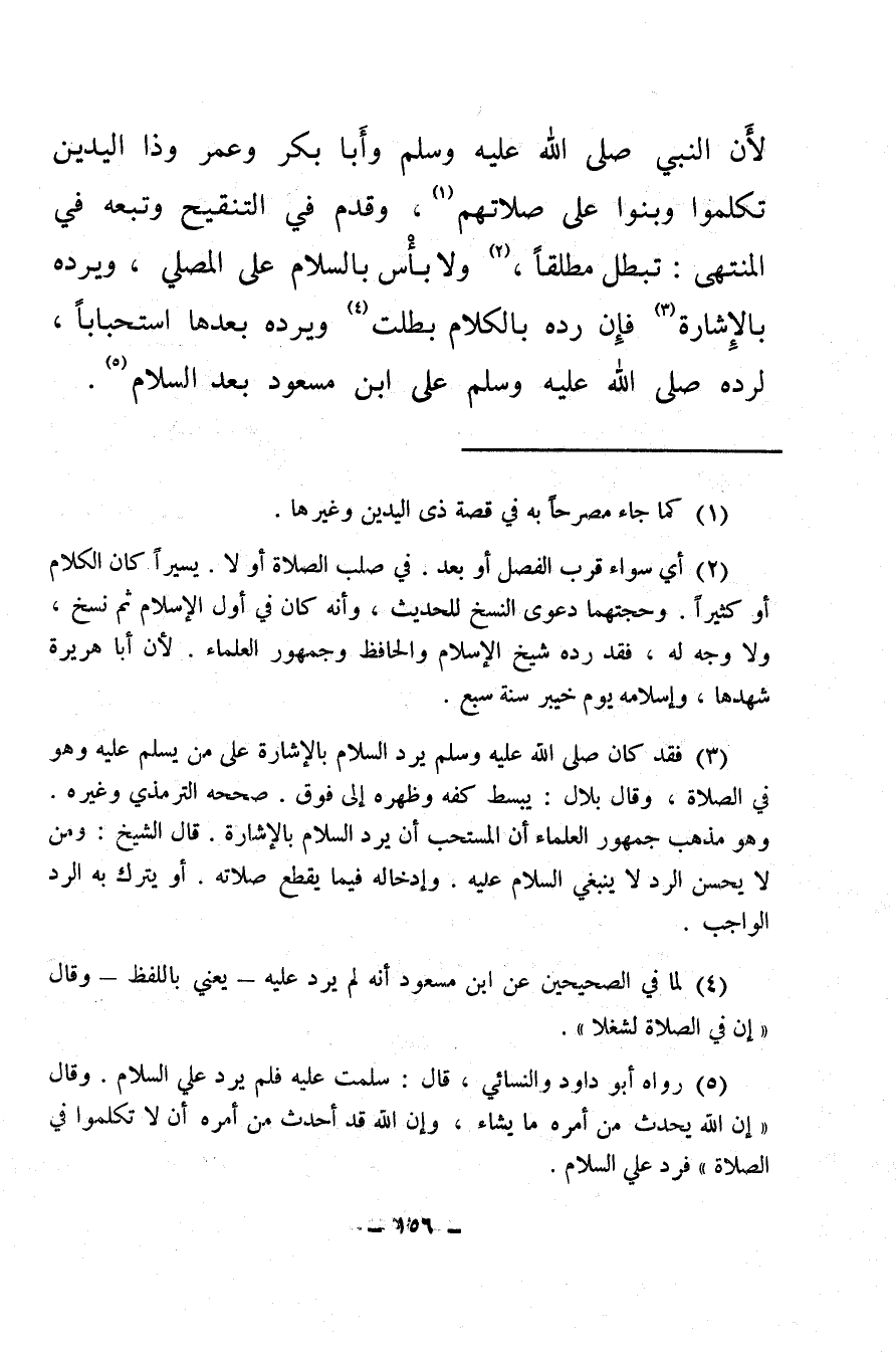 (¬5) رواه أبو داود والنسائي، قال: «سلمت عليه فلم يرد علي السلام، وقال: «إن الله يحدث من أمره ما يشاء، وإن الله قد أحدث من أمره أن لا تكلموا في الصلاة» فرد علي السلام.