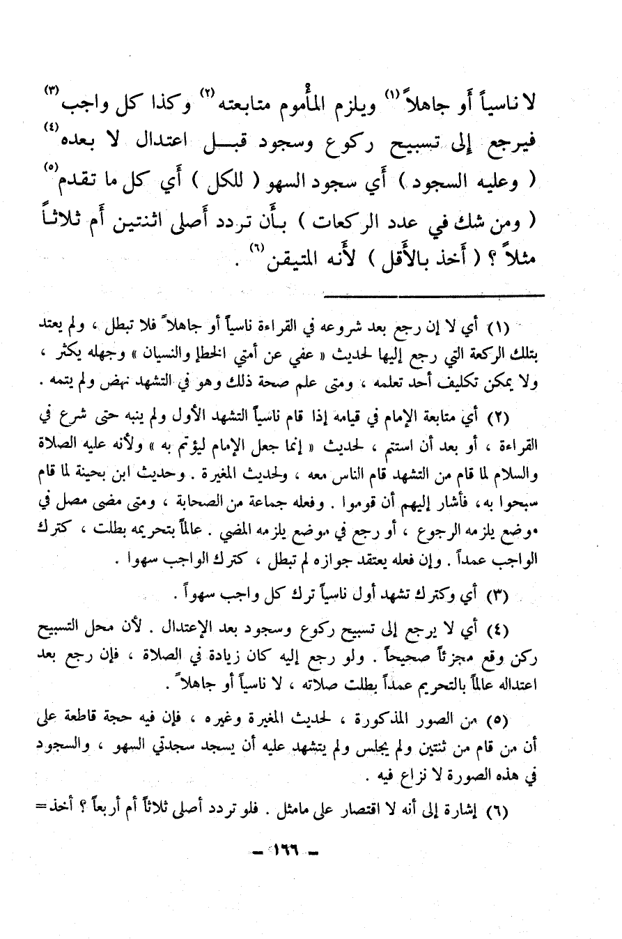 لا ناسيا أو جاهلا (¬1) ويلزم المأموم متابعته (¬2) وكذا كل واجب (¬3) فيرجع إلى تسبيح ركوع وسجود قبل اعتدال لا بعده (¬4) (وعليه السجود) أي سجود السهو للكل أي كل ما تقدم (¬5) (ومن شك في عدد الركعات) بأن تردد أصلى اثنتين أم ثلاثا مثلا؟ أخذ بالأقل لأنه المتيقن (¬6) .