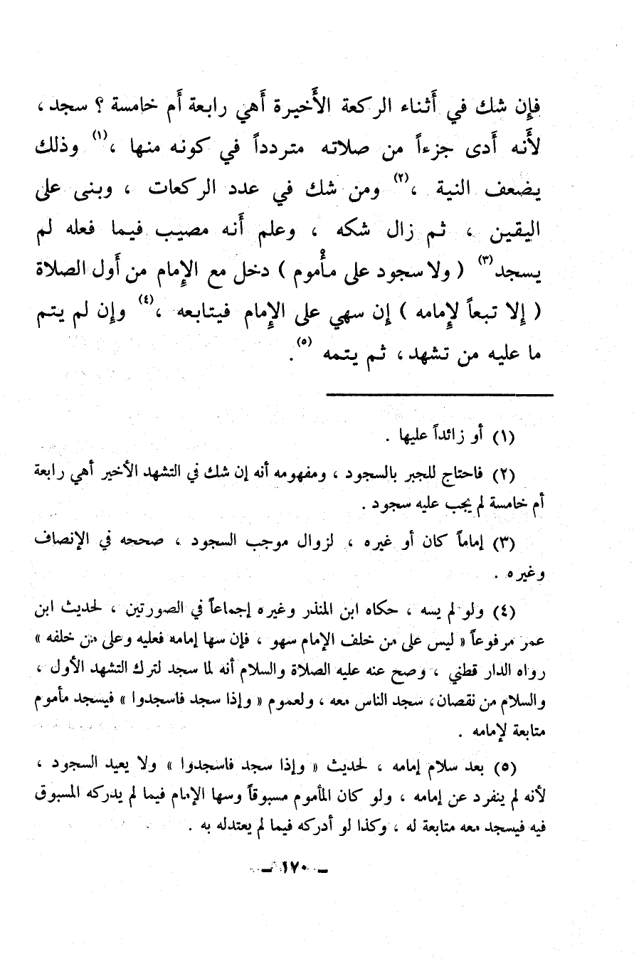 فإن شك في أثناء الركعة الأخيرة أهي رابعة أم خامسة؟ سجد، لأنه أدى جزءا من صلاته مترددا في كونه منها (¬1) وذلك يضعف النية (¬2) ومن شك في عدد الركعات، وبنى على اليقين، ثم زال شكه، وعلم أنه مصيب فيما فعله لم يسجد (¬3) (ولا سجود على مأموم) دخل مع الإمام من أول الصلاة (إلا تبعًا لإمامه) إن سهي على الإمام فيتابعه (¬4) وإن لم يتم ما عليه من تشهد ثم يتمه (¬5) .